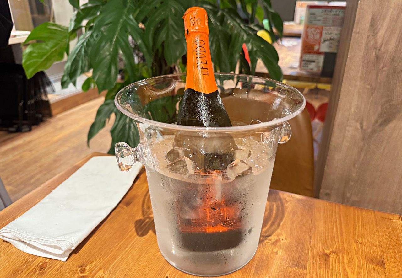 まずは乾杯のスパークリングワイン。すっきりとした飲み口で、甘すぎず食事のスタートにちょうどよい爽やかさです。