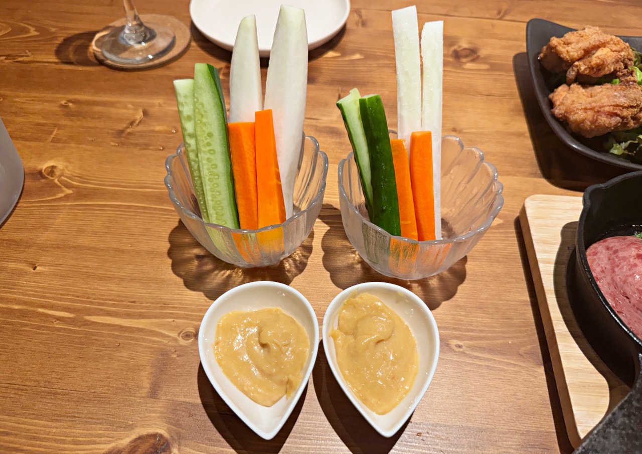 野菜スティック(特製ディップソース添え)は、大根・にんじん・きゅうりそれぞれのシャキシャキ感がしっかり。特製ディップはコクがありつつも重すぎず、野菜の甘みを引き立ててくれます。