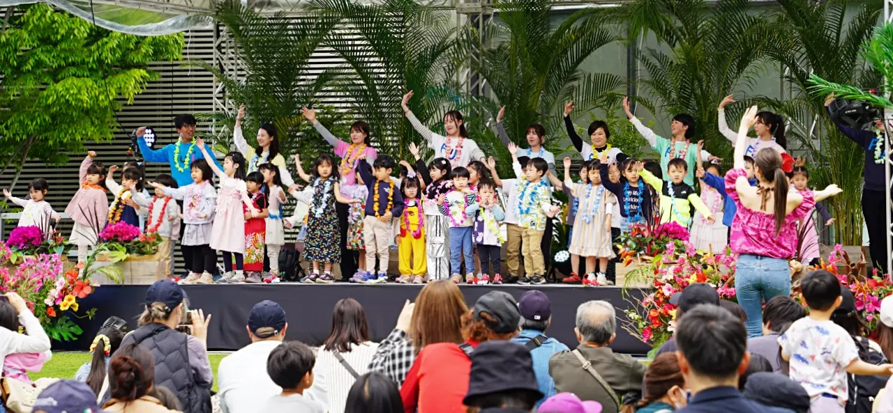 こちらでは、誰でも参加できる「メレフラ・パーティー」が開催。1階は、ステージに出演したフラ教室の皆様が集合。 ステージの輝きがフロアへと広がり、会場全体がハワイの風に包まれる瞬間です。
