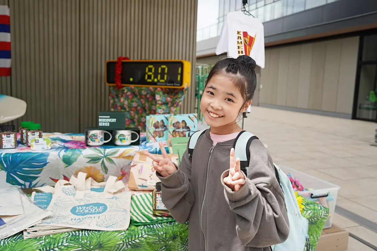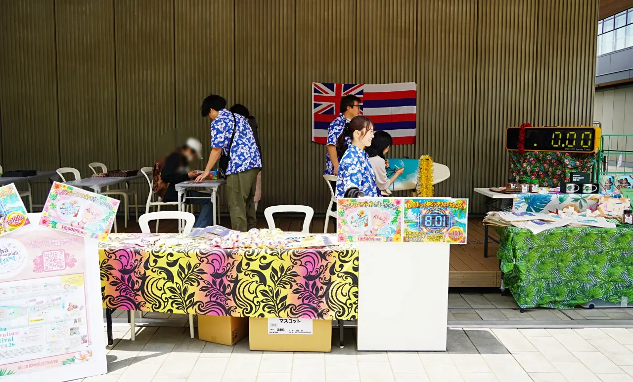 立飛グループ社員による体験ブースでは、「8.01(ハワイ)秒ピッタリチャレンジ」を開催。成功者にはハワイ直輸入グッズがプレゼントされるということもあり、大盛況となっていました。