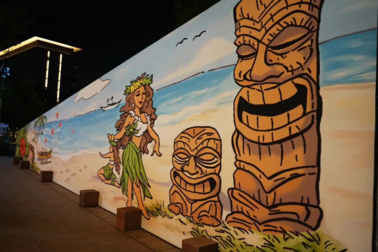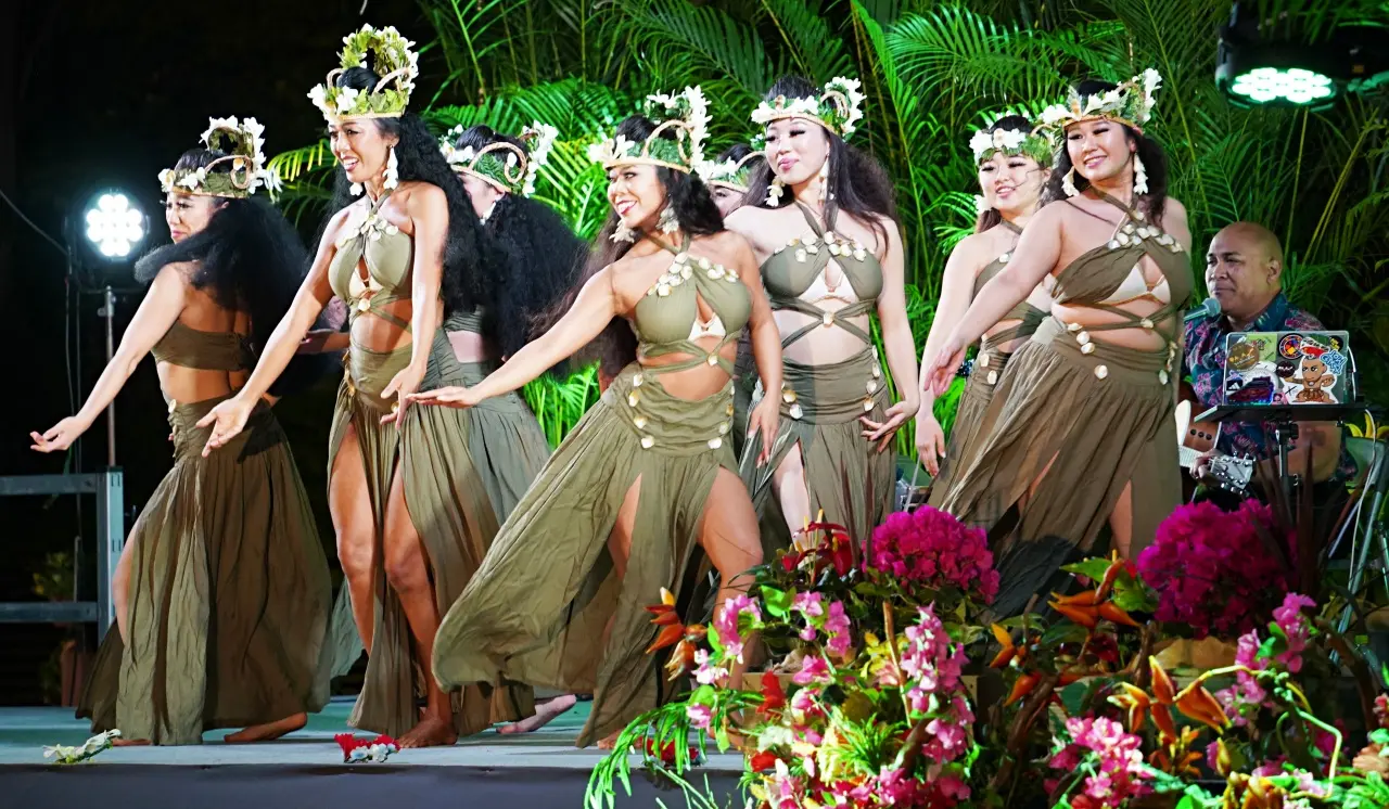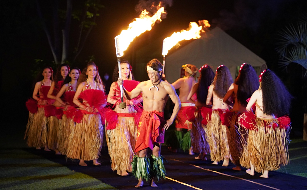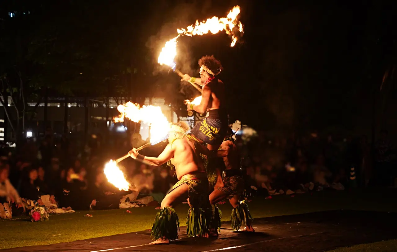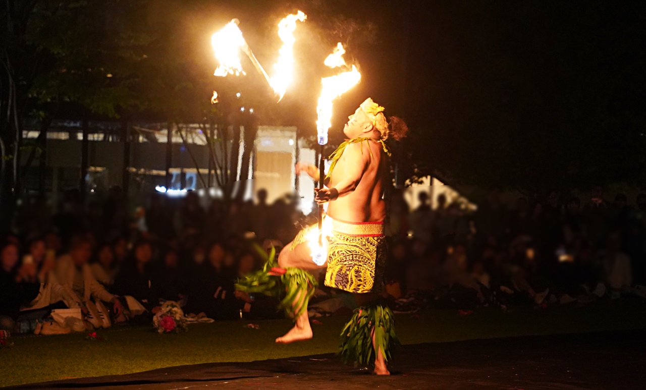 「メレフラ・パーティー」が終演し、そのまま芝生広場へ。「Mevina & Tavake Rereata」によるタヒチアンダンスショーでは、一転して情熱的なステージに。力強く美しいパフォーマンスに、多くの観客が釘付けとなっていました。